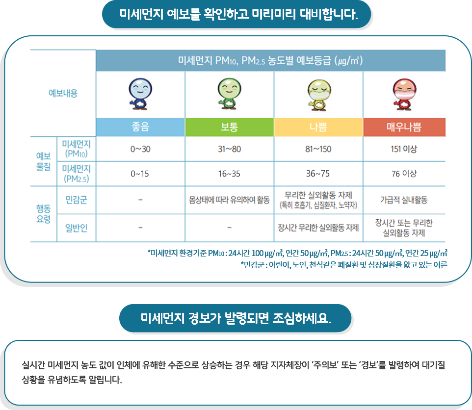 - 미세먼지 ‘나쁨’ 이상일 경우 외출 자제 및 KF80 이상 마스크 착용